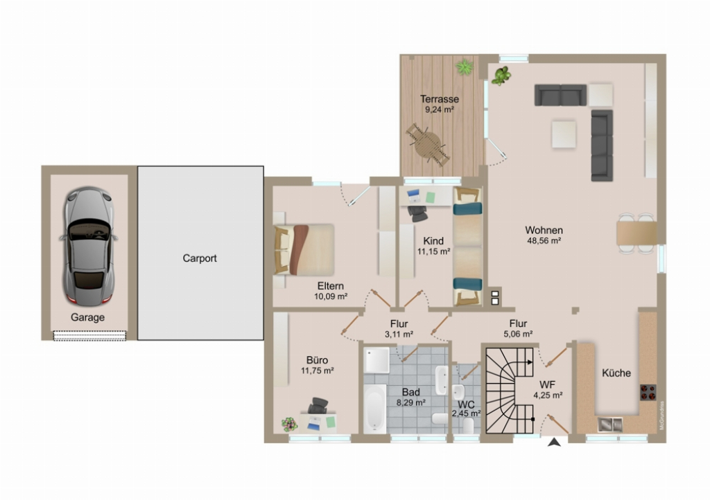 Die Einliegerwohnung bietet zusätzliche Flexibilität: ob als separate Wohneinheit für Angehörige, als Gästebereich oder zur Erzielung von Mieteinnahmen – dieses Extra steigert den Nutzwert der Immobilie spürbar.